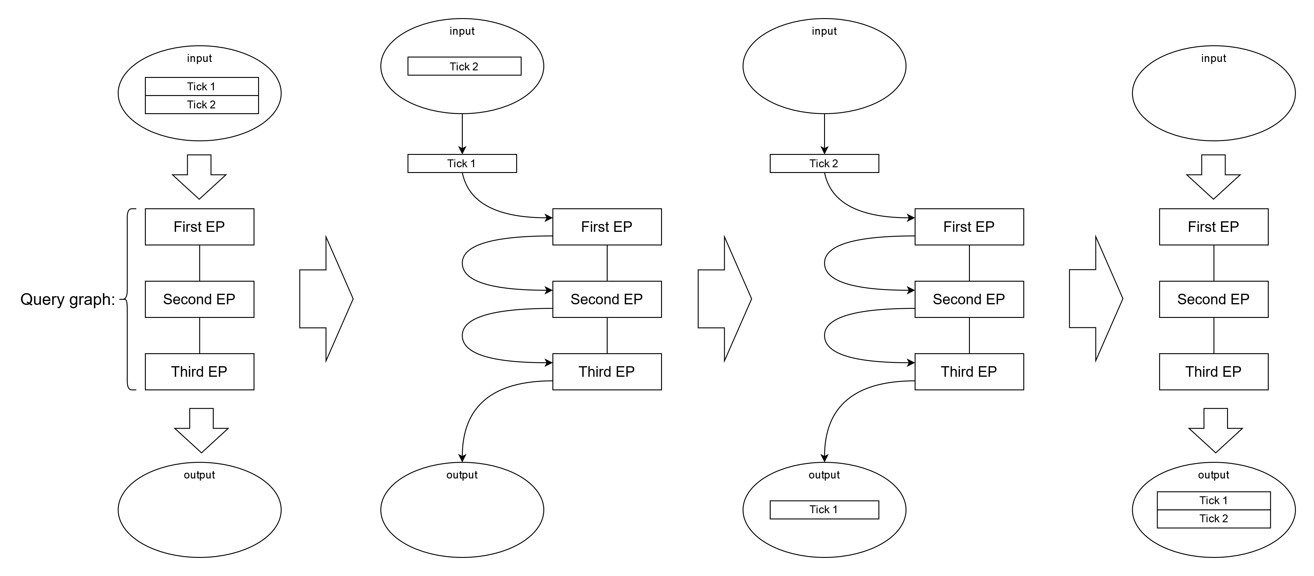 onetick.py.eval()is used to initialize a state variable (for example, a tick set), then the query inonetick.py.eval()will be executed before the main query, and its results would be stored in the state variable.When some EP accesses a state variable to read or modify its value, variable access or modification happens when an input tick is passing through this EP. Therefore, most operations done to state variables (other than initialization) are triggered by tick passage through the query. So, to know which value the state variable will hold for a particular tick, it’s important to understand the overall order of tick processing.